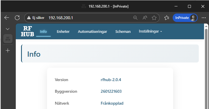 4. Öppna sedan din webbläsare och gå till http://192.168.200.1 för att få upp RF-Hub:ens användargränssnitt. Läser du denna artikel på samma enhet kan du klicka på länken för att öppna den.