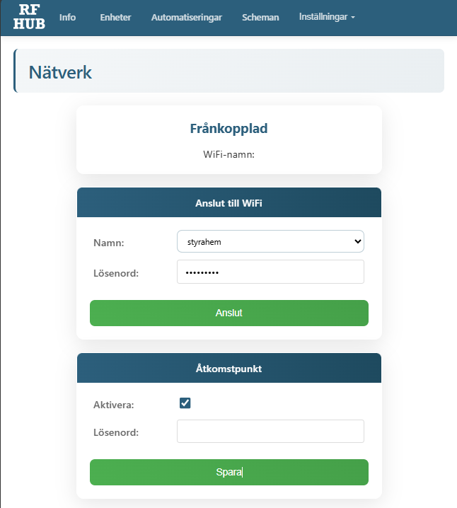 7. Välj eller skriv in namnet på ditt nätverk och lösenordet. Notera att det ska vara ett nätverk som kan köra 2,4GHz. Klicka sedan på Anslut och efter en stund ska Frånkopplad ändras till Ansluten. Slå sedan av Åtkomstpunkten eller sätt ett lösenord så inte någon obehörig kan ansluta till din enhet.