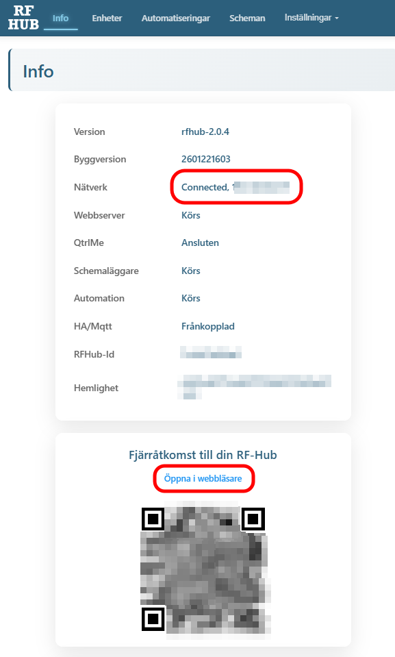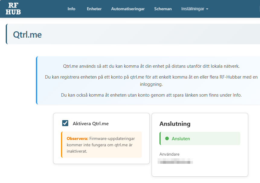 9. Om du enkelt vill komma åt dina enheter kan du skapa ett konto på Qtrl.me, [https://qtrl.me] och sedan koppla din RF-Hub dit. När du har skapat ett konto på Qtrl.me går du in på din RF-Hub under Inställningar och Qtrl.me och klickar på länken för att ansluta din RF-Hub. När den är ansluten kommer det se ut så här: