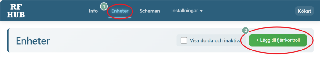 Om man inte redan har en fjärrkontroll kan man i RF-Hub skapa nya virtuella fjärrkontroll i RF-Hub. Det gör man genom att gå in under Enheter och klicka på “+ Lägg till Fjärrkontroll”.