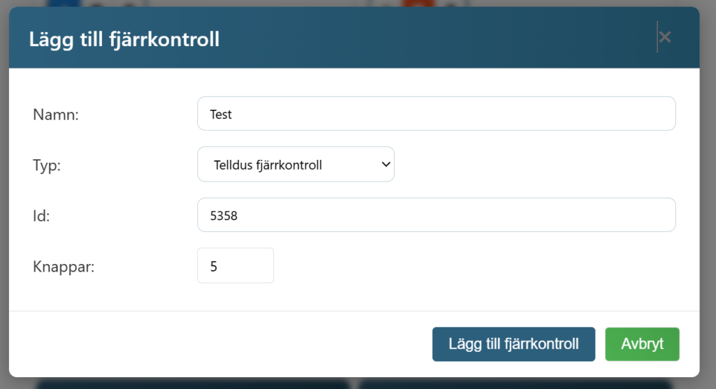 Då får du upp ett fönster där du kan namnge fjärrkontrollen och välja hur många knappar du vill ha på den. ID är ett unikt id för fjärrkontrollen och normalt kan du bara använda det framslumpade värdet.